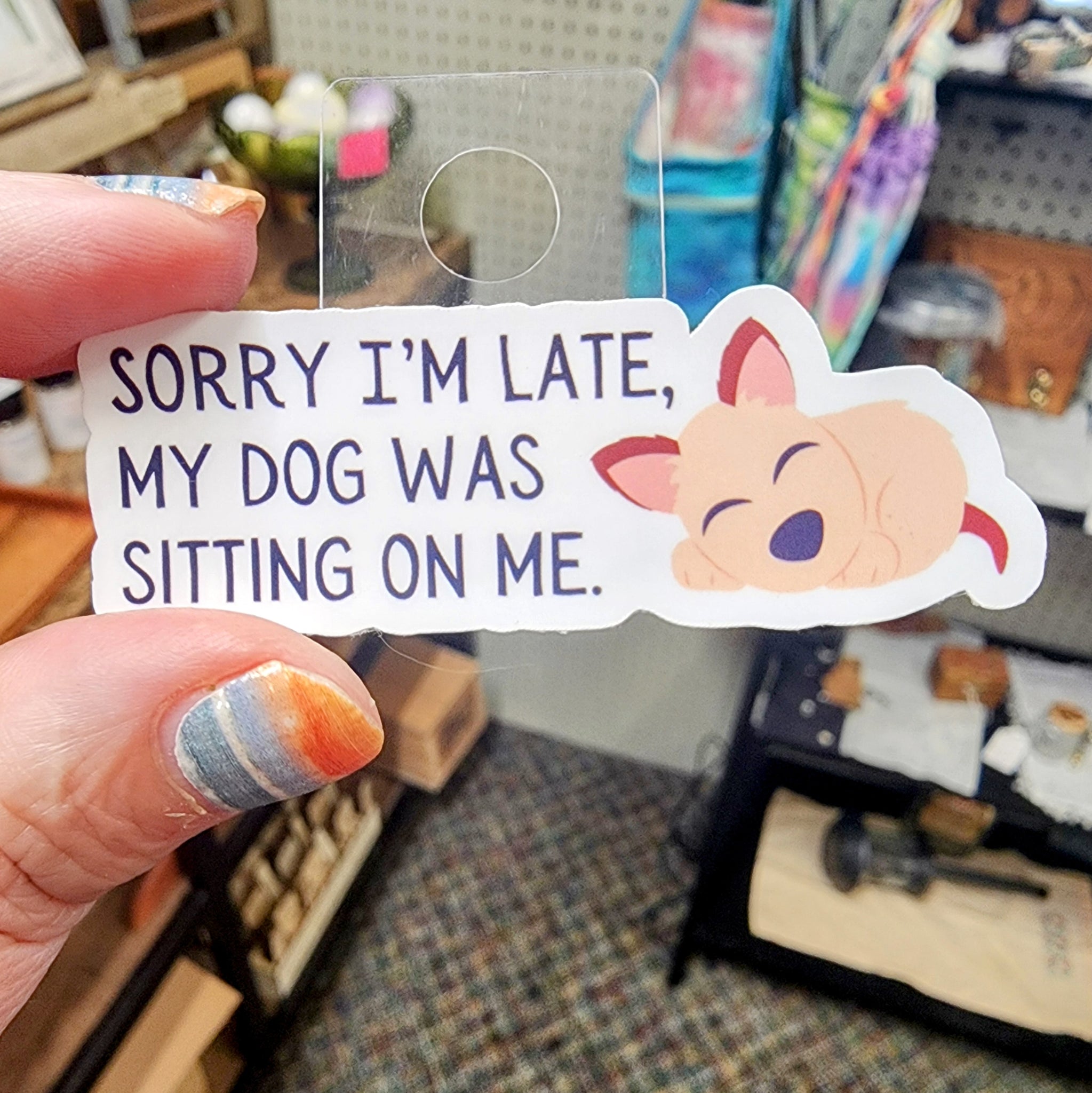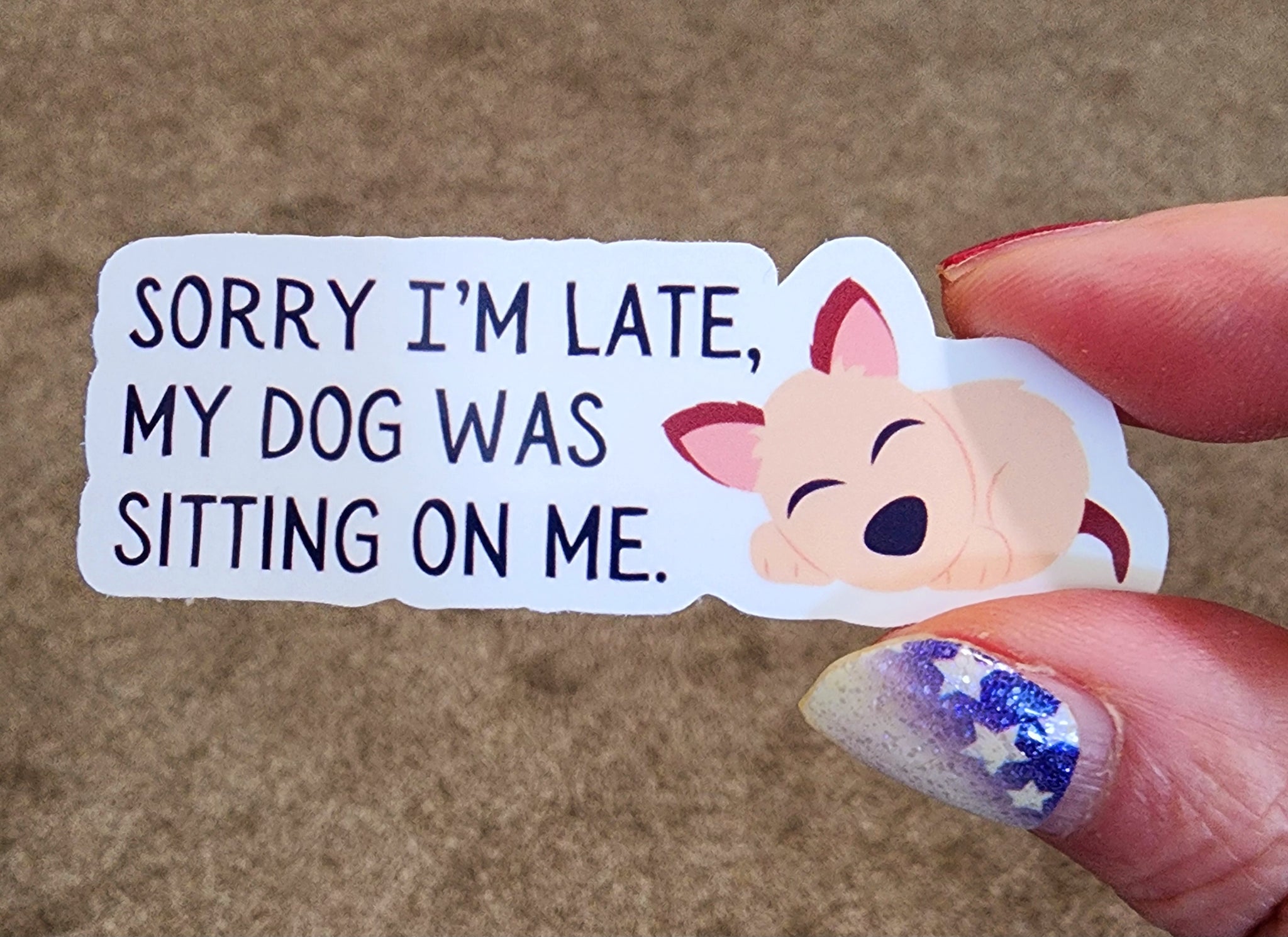 If you've ever been held hostage by a sleeping dog, this sticker is for you. Featuring the relatable phrase "Sorry I'm late, my dog was sitting on me," it's a must-have for dog lovers who know that moving a comfy pup is simply not an option.